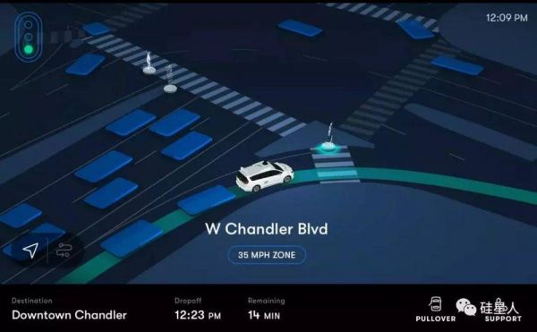 Waymo 行驶时,周围的障碍物和行人会被蓝色标出,实时更新位置,而 Waymo 决定选择的路线则会用绿色标出。因此,前方路况、无人车什么时候打算变道、决定走哪条路,乘客都可以看得一清二楚。