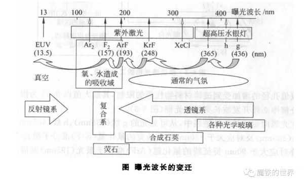 这其中,光学系统是光刻机的核心,因此,可以按光源划分光刻技术的不同发展阶段。自20世纪50年代以来,光刻技术经历了紫外全谱(可见光)、g线(波长436nm)、深紫外(DUV,波长193nm)、极紫外Extreme Ultraviolet,简称EUV,波长13.5nm)等五个阶段。