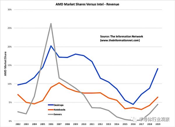 据seekingalpha的分析指出,图1显示了同期AMD的市场份额与Intel的台式机,笔记本电脑和服务器的细分情况。AMD在台式机上的份额接近15%,这是由于AMD在2019年末推出了32核3970X和24核3960X Threadripper处理器。与英特尔最新的i9-10980X CPU相比,它们在视频和3D渲染方面的性能更高。