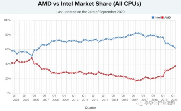 AMD与英特尔的台式机,笔记本电脑和服务器的份额比对(图源:seekingalpha)