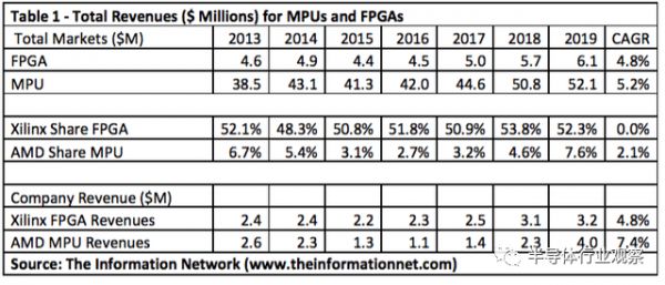 让我们来看下Xilinx的FPGA和AMD的MPU收入情况。如seekingalpha所列表格所示,在过去六年中,Xilinx的FPGA市场份额一直徘徊在50%左右,但Xilinx CAGR为0%。相比之下,AMD在整个MPU市场中的份额很小,但后来却有所增加。而将市场份额乘以整体市场可得出两家公司的收入。在这种情况下,我们可以看到两个市场中两家公司的收入大致相同。但是AMD的收入一直以7.4%的复合年增长率增长,而Xilinx的FPGA收入仅以4.8%的复合年增长率增长。