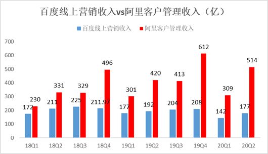 从外部环境来看,百度也早已不是众多商家投放广告的首选。2020年2季度,阿里巴巴客户管理(即线上广告)收入达到514亿元,百度的线上营销收入仅仅为177亿元,只有前者的1/3。