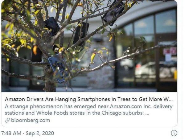 9月份,彭博社报道,在坐落于纽约近郊区的全食超市周边,出现了一种怪异的状况:很多手机被挂在树上。这些手机上就是也是亚马逊送货司机挂的,目地是为了更好地抢单。