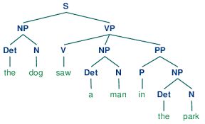 一个帮助人工智能理解人类语言结构的树形结构案例,动词词组,名词词组和介词词组被拆分,单词则按照逻辑联系强弱进行再分组 | https://www.nltk.org