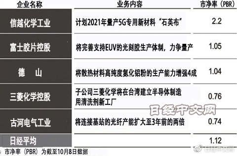 这些“隐藏的5G股”大多是随着最终产品和服务的普及而中长期获益的业务模式。除了追求最高份额、已完美将技术实力转化为企业价值的信越化学以外,日本的其他材料企业都很难说向投资者充分宣传了自身魅力,市净率都低于日经平均的倍率。