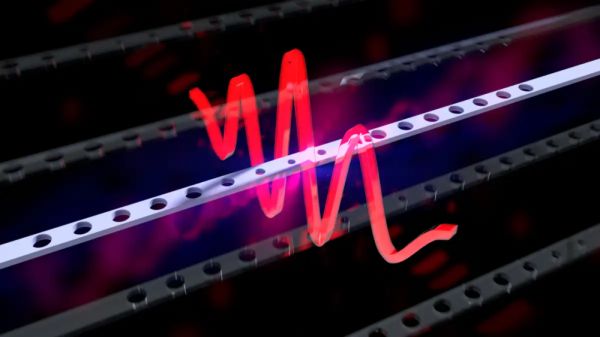 量子叠加中谐振器的示意图。红色的波代表波函数。| 图片来源:Christopher Baker