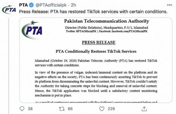 (原标题:巴基斯坦电信管理局宣布解除TikTok禁令)