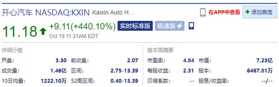 新浪科技讯 10月19日晚间消息,中概股开心汽车涨幅扩大至500%,截止发稿,涨幅回落到440.10%,报11.18美元,市值达7.23亿美元。