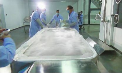 紧接着,展文莲被救护车快速转运至银丰研究院低温医学研究中心,接受至关重要的灌流置换手术,即将血液置换成冷冻保护剂,尽可能减少降温保存造成的冷冻损伤。山东大学齐鲁医院心外科医生、麻醉专家以及体外循环灌注师参与了这一过程,他们从展文莲的颈部和股部建立双通路体外循环,在特制的低温手术台上,将其体温降低到18℃左右,然后将透明的、乳白色的防冻剂,缓缓注入展文莲体内。