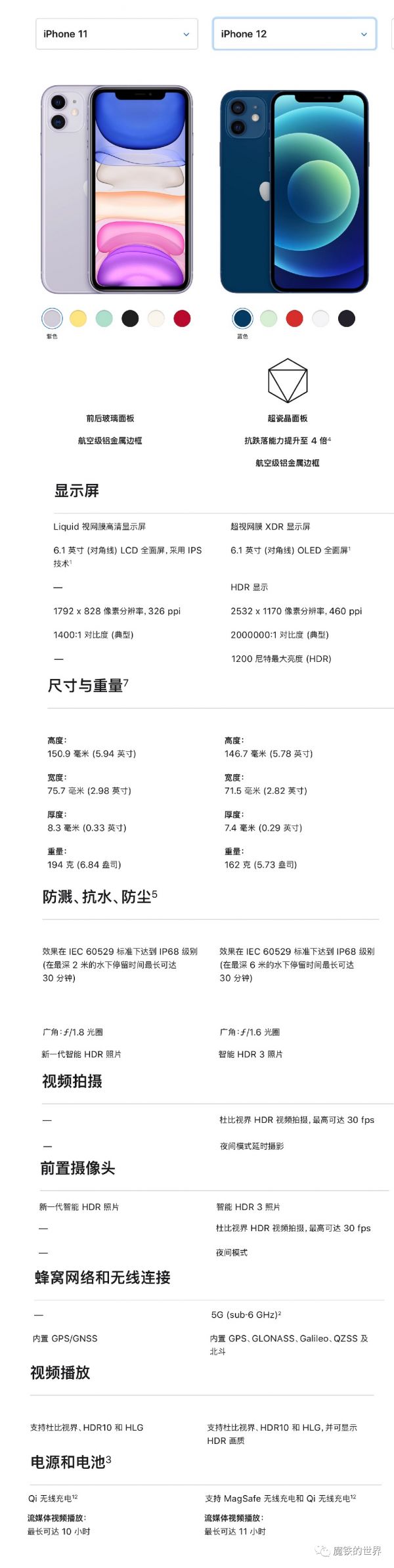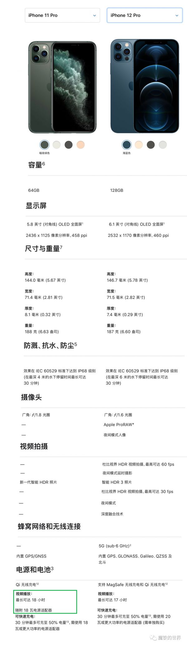 iPhone 11 Pro降级的地方有所不同,主要是视频播放时间为17小时,比iPhone 11 Pro少了1小时,即续航时间减少了大约6%,意味着电池容量有肉眼可见的缩水。电池缩水的直接原因是,iPhone 12 Pro为了显瘦,厚度减薄0.7毫米,电池相应变薄,容量变小。