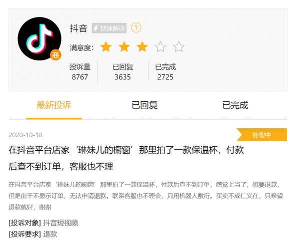 “好商品、好服务”的实现需要平台介入管理。此前,曾有媒体援引“黑猫投诉”数据,反映消费者在抖音遇到的退换货难、无客服应答等问题。