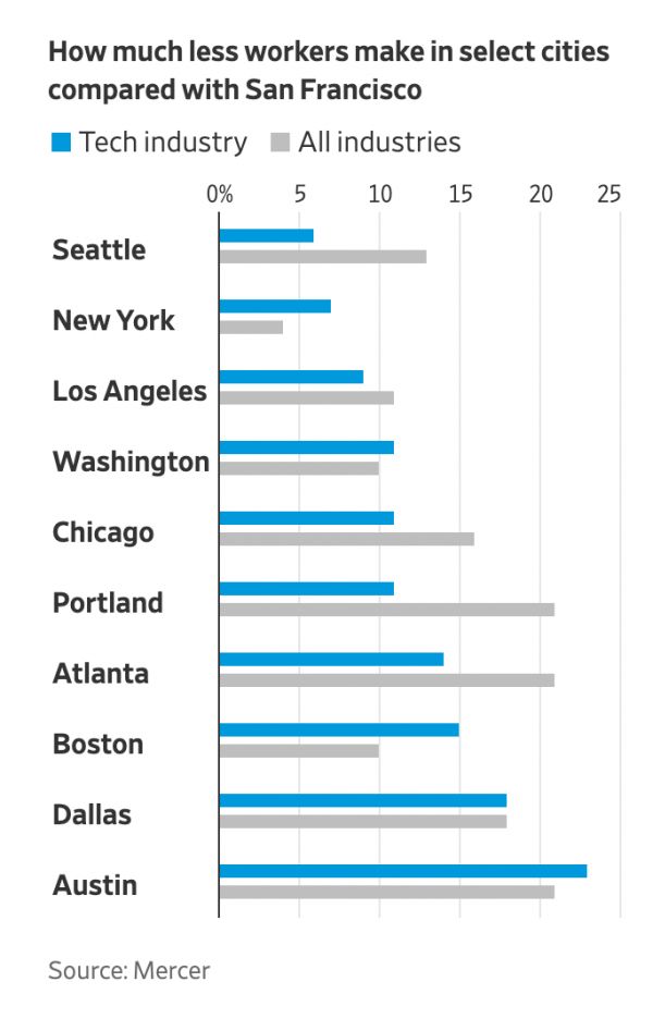 上个月,Stripe 宣布他们将会给搬离旧金山、纽约、西雅图的员工给予一次性的 2 万美元的补偿,但是相应的,他们必须接受最高 10% 的降薪,而具体的幅度则是由他们未来会在哪里定居决定的。