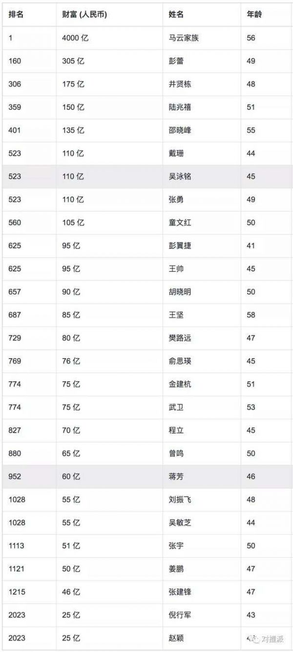 但马云之外,阿里系依然是「造富狂魔」,一共27人上榜,彭蕾、井贤栋、陆兆禧、邵晓峰、戴珊、吴泳铭、张勇、童文红财富均过百万。
