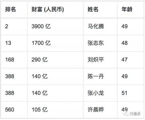 和去年一样,第二名的位置依旧属于马化腾,财富3900亿,只比马云少100个小目标。不过增长速度倒是略微快于马云,达到了增幅50%。