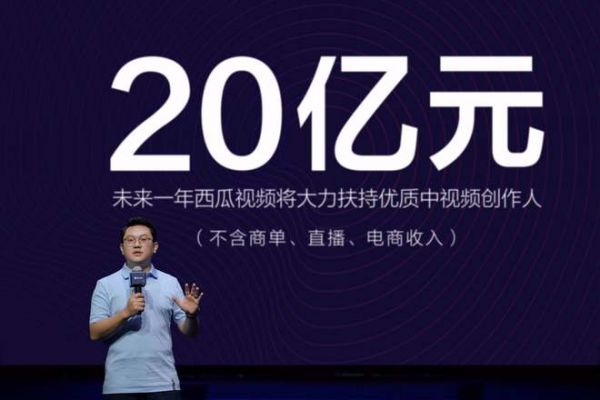10月20日,在2020西瓜PLAY好奇心大会上,西瓜视频总裁任利锋宣布,未来一年西瓜视频将至少拿出20亿元用于补贴,与优秀的视频创作者一同发力“中视频”赛道。