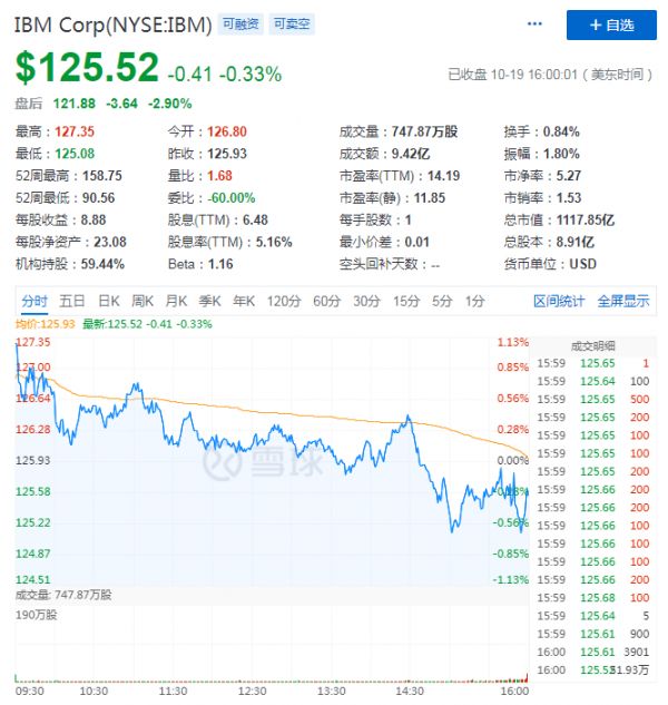 美东时间10月19日盘后,IBM对外发布2020财年第三季度的财报,财报公布后,刺激其股价在盘后交易中下跌约3%。虽然其股价下跌不无受三大股指集体下行的影响,但高于大盘的跌幅也表明了资本市场对这份财报的态度。截至美股研究社发稿,IBM盘后每股报121.88美元,盘后下跌2.90%,总市值为1117.85亿美元。