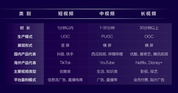 这是抖音快手、优爱腾的短视频、长视频概念下的新区分点。简单来说,“中视频”即时长在1分钟至30分钟的视频内容,相较短视频,中视频大多为横屏,PGC(专业生产内容)占比更高。