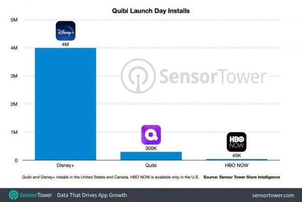 Quibi上线首日下载量与迪士尼+、HBO NOW对比