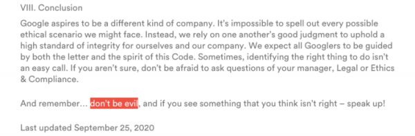 ▲ “不作恶”口号依然存在于谷歌最新版的公司行为准则之中(图源:Alphabet)