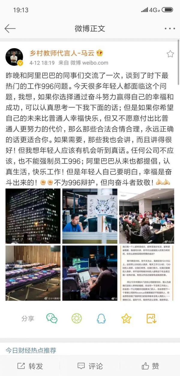 4月12日,阿里巴巴官微分享了马云在阿里内部交流活动《帕特纳有约》上对近来热门话题“996”工作制的看法。