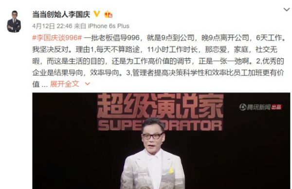 在这一次互联网对“996”工作制的集体发声中,当当网创始人李国庆是罕见的明确表示反对的大佬。