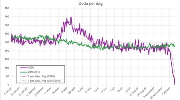 另外,把瑞典国家统计局发布的每日死亡人数统计数据纳入考量依据的话,疫情爆发以来,瑞典死亡人数明显高于2015~2019年同期的月份为三月至五月,入秋以来并无明显同比增长的死亡人数。