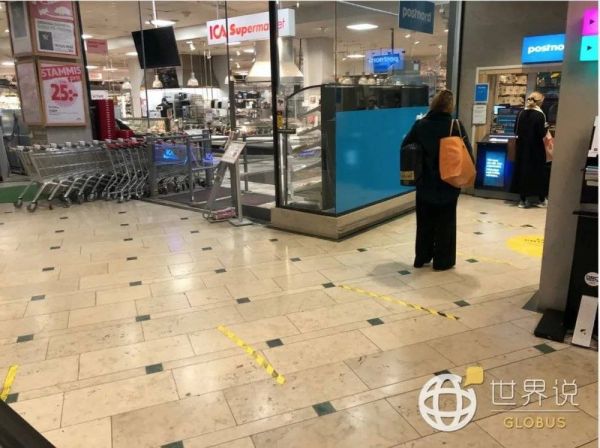 ● 超市旁邮局入口处用黄线画出社交隔离标识 / 世界说