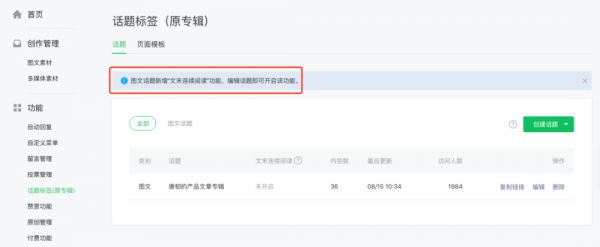 这个功能的设置是在后台「话题标签」栏目下,这个栏目的前身是「专辑」,再之前叫「页面模板」。