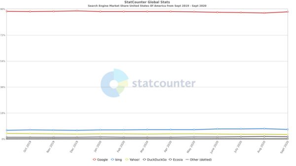从客观的市场数据来看,谷歌自然是垄断了。根据 Statcounter 的数据来看,截至 2020 年 9 月,谷歌占据美国搜索引擎市场的 88.14%——此次诉讼的争议在于“谷歌的垄断是否违法”上。