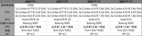另外可以看到,和去年麒麟 990 4G 不同的是,定位较低的 9000E 在制程等参数上并没有明显阉割,只有 CPU 的主频和 CPU 和核数稍逊,也能保证一个不错的体验。