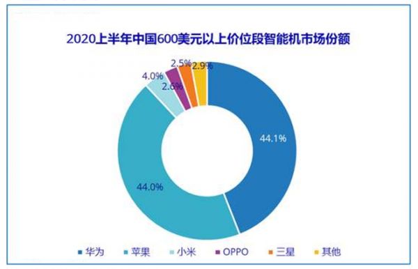 根据 IDC 数据显示,在今年上半年 600 美元以上价位手机产品方面,华为的市场份额达到 44.1%,以 0.1 的微弱优势超过苹果,排名第一。