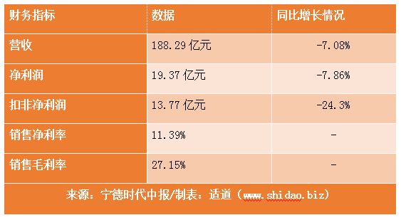 中报显示宁德时代实现营业总收入188.29亿元,同比下降7.08%,归母净利润19.37亿元,同比下降7.86%。