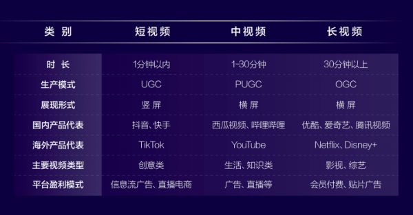 答案显然都是无法概括,更不适用于两类中任何一类的运营策略,而这其实就是所谓的中视频,它就是指在短视频和长视频中间,时长在1min到30min以内,通过横屏的方式展现,并以UGC或者PUGC内容为核心的视频内容形式。