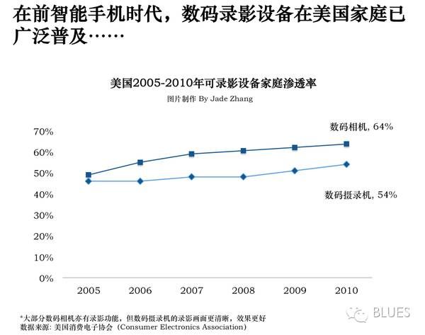 例如,到2005年,美国可录像设备的家庭渗透率已经接近50%,到2010年,美国数码相机和数码摄录机的家庭渗透率分别达到64%和54%。而在同一时期,数码相机和DV在中国家庭的普及率却不及美国家庭的十分之一。