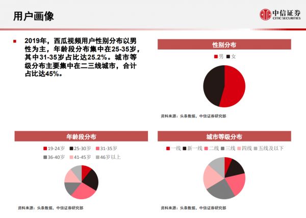据中信证券的报告数据显示,西瓜视频的用户年龄主要集中在25~35岁之间。同时无论是在性别,年龄层次,还是在在城市分布上都显得比较均匀。