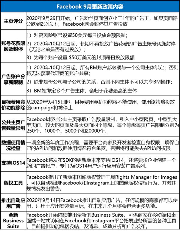 2020年9月以来,Facebook连续发布了多条新政,涉及到主页、账户花费、账户分享、数据、工具等多个方面。新政旨在持续打造安全以及可信的平台环境、提升消费者和广告主的使用体验、改善广告表现等。出海企业应对新政内容做到了然于心,做出针对性的改变,防止封停等现象出现。同时,利用好Facebook推出的新工具,提升广告成效。