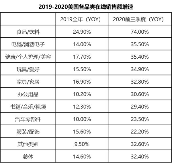 各品类的在线销售额也快速增长,以美国市场为例,2020年前三季度,各品类销售额增速均高于2019年,电脑/消费电子、办公用品、玩具/爱好、健康/个人护理/美容、家具/家居等宅经济相关品类增幅更为明显,也正是出海企业主要投放的品类。