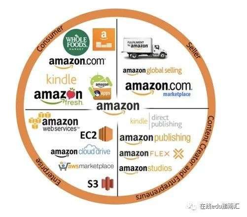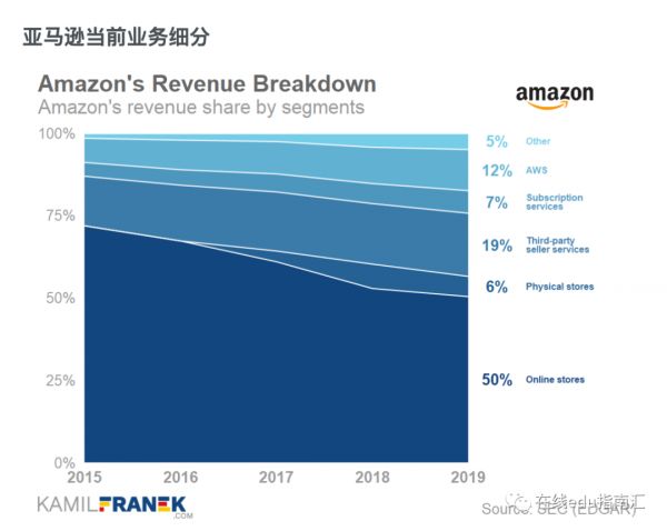 亚马逊当下的营收,一半来自起家的在线电商销售,19%来自第三方卖家服务。6%来自实体店;7%来自包括Amazon prime等会员订阅服务费用。12.5%来自AWS技术服务。