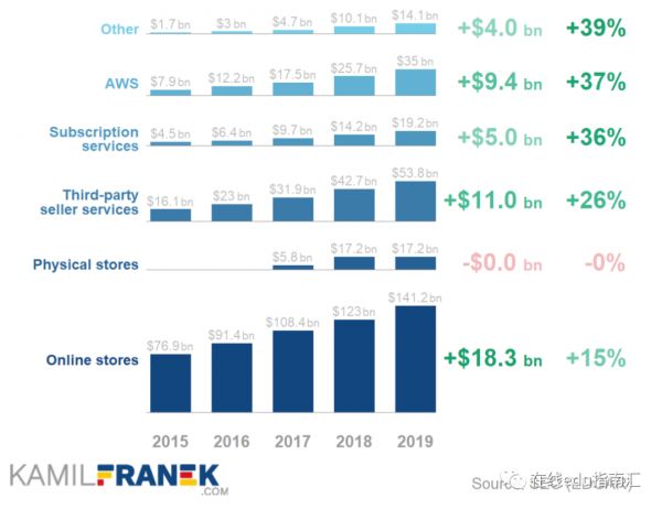 这个角度,可以看到亚马逊在保持主体业务体量的同时,在新兴业务上的有效探索与持续发力。
