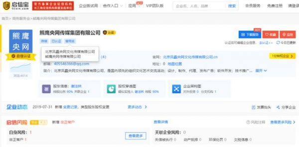 另一方面,启信宝信息显示,央视网声明中提到的熊鹰央网传媒集团有限公司,成立于2015年4月1日,注册资本为1.07亿元人民币。