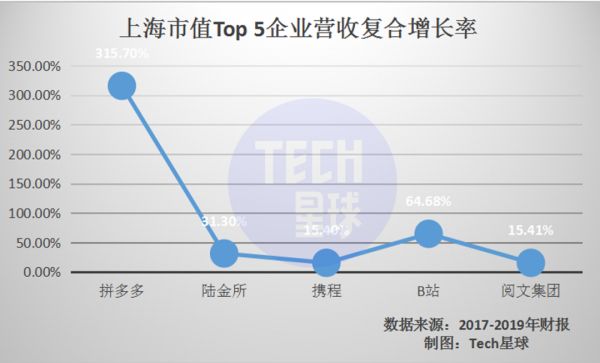 从2017年-2019年的财报数据看,上海互联网企业中,营收保持30%以上复合增长率的有拼多多、B站和陆金所,尤其拼多多达到了315%之多,应该说千亿美金市值不会是其终点。破圈的B站符合增长率也超过60%,是上海的下一代希望之星。
