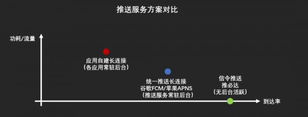 相比传统的、基于数据长连接的推送方案(苹果APNS/谷歌FCM),“推必达”服务可以在0待机功耗、0待机流量甚至无数据网络的情况下,保证消息的高可靠到达。
