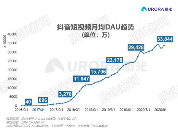 抖音2016-2020年日活跃用户数增势,仅统计抖音App