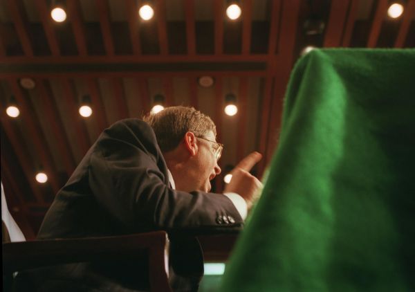 1998年,微软公司时任首席执行官比尔·盖茨(Bill Gates)在反垄断听证会上作证。图片来源:Stephen Crowley/The New York Times