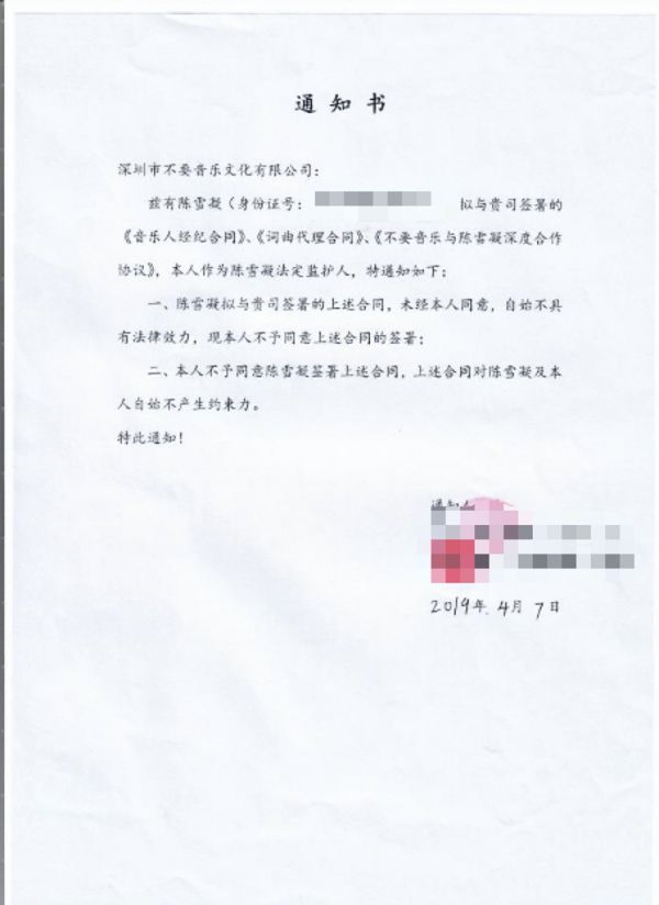 4月5日,陈雪凝委托律师寄来《通知书》,以签约时陈雪凝年龄不足18岁,未获监护人同意为由而试图单方面终止合约。这个单方面的解约让周洛和团队都感到意外。