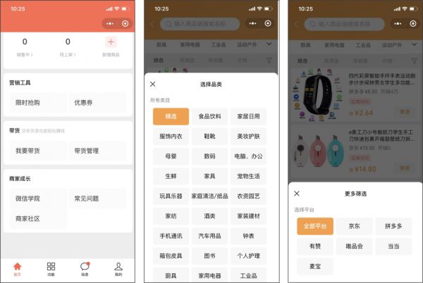 10月22日,微信小商店正式上线“无货源带货”功能,据小编体验,只需完成简单的开店流程,用户便可选择自身感兴趣的货源带货,并获得佣金。货品共计分为27个类目,而从货源上看,并不局限于小店本身,已与多个电商平台(含:拼多多、京东、有赞等)打通。