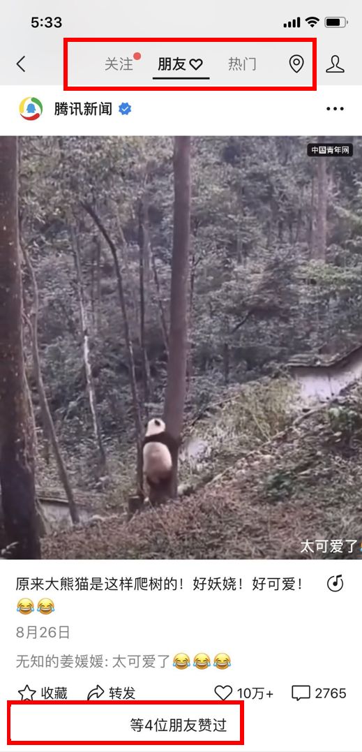 而从6月起,这个状态随着视频号的大改版迎来了突变。视频号首页由单一信息流划分为“关注、朋友点赞、热门和附近”4个模块,与此同时,是不断深化增强的社交互动功能,如:新增@功能;将“点赞”重要性提升,被点赞动态会出现在默认的“朋友点赞”页面,同时在发现页“视频号”一栏里,也增加了红点强提醒。