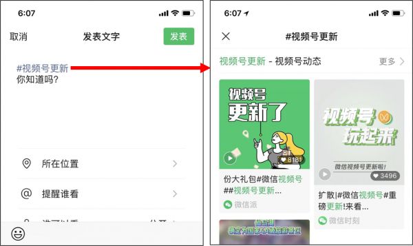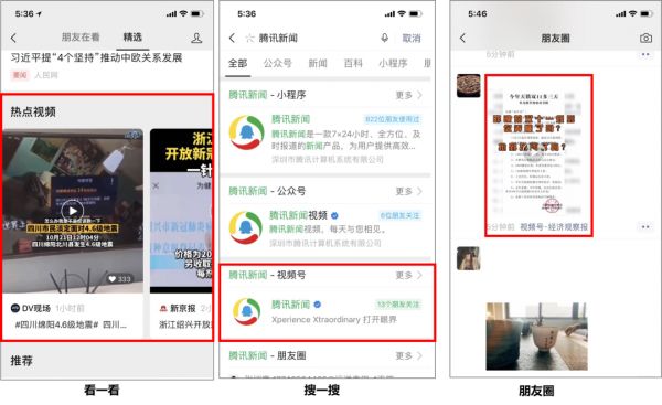 从公域端看,有:搜一搜、看一看(精选热门视频)、公众号(尚处于内测阶段)等;而从私域端:发现页(仅次于朋友圈、排名第二)、朋友圈、朋友圈标签(即:用户在发布某个内容时,#话题,即可导流到该话题标签导向的视频号内容聚合页)、微信群、微信聊天对话框等。