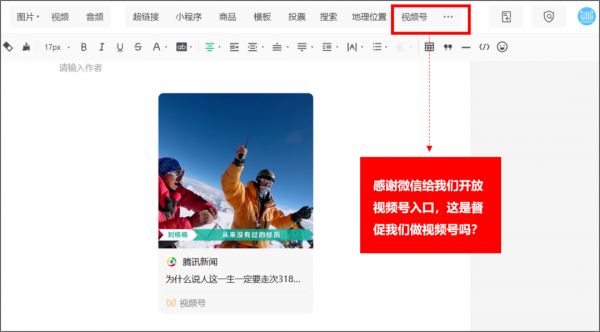 对于视频号创作者而言,视频号从一开始就支持跳转到公众号,这无疑为增粉困难的公众号涨粉、付费阅读开辟了新的路径;而现处于测试阶段的公众号支持插入视频号内容,则为公众号大V入场做视频号提供了便利。