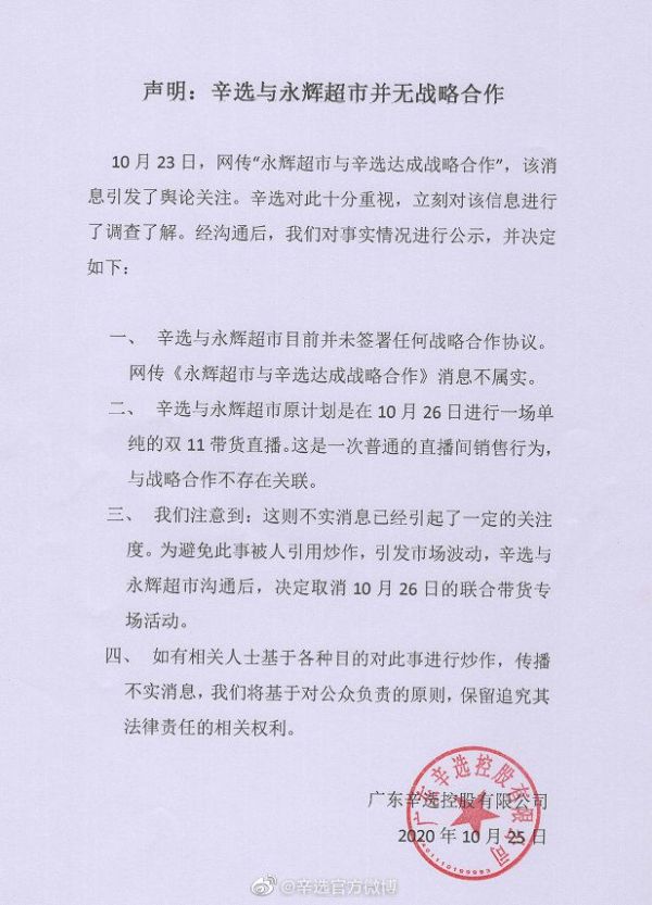 近日有消息称,永辉超市与辛选达成战略合作,要在10月26日晚打造永辉x辛选专场直播。但在10月25日辛巴在官微回应传闻,称辛选与永辉超市目前并未签署任何战略合作协议。“辛选与永辉超市原计划是在10月26日进行一场双11带货直播。这是一次普通的直播间销售行为,与战略合作不存在关联。为避免引发市场波动,辛选与永辉超市沟通后,决定取消10月26日的联合带货专场活动。”